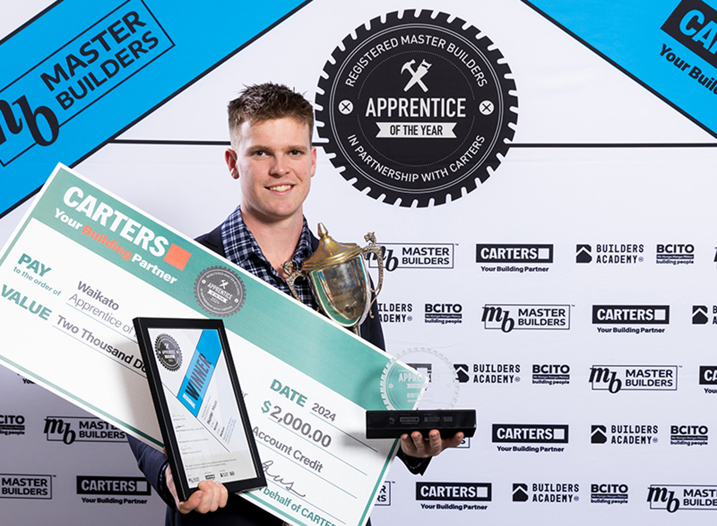 Last year’s winning apprentice was Hunter Moon, from the Waikato region. Hunter was awarded the 2024 Registered Master Builders CARTERS Apprentice of the Year title, with second place going to Daniel Smith from Auckland, and Adam Harford from Canterbury placing third.