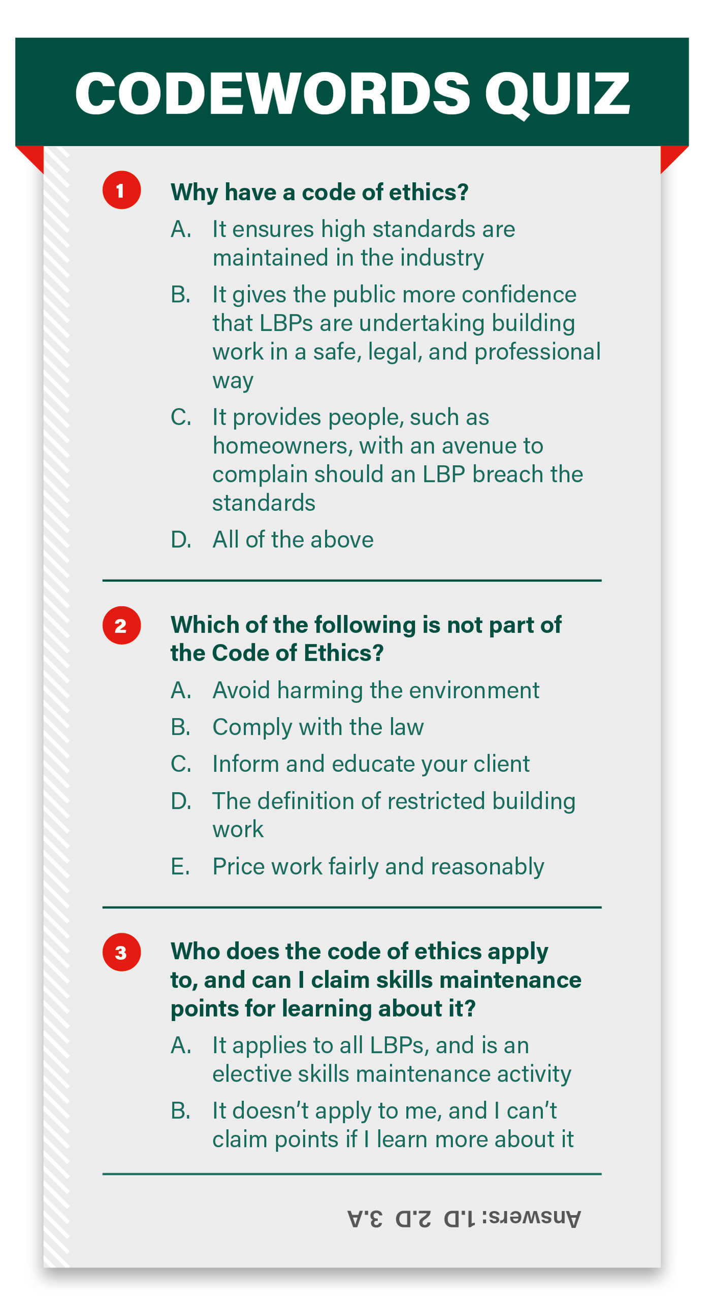 The code of ethics ensures high standards are maintained in the industry, while giving the public more confidence that LBPs are undertaking building work in a safe, legal, and professional way.