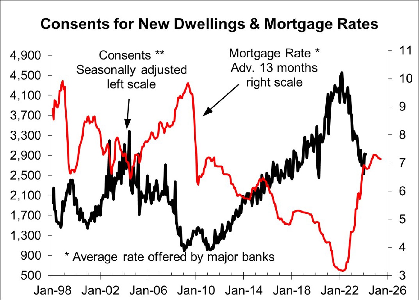 As shown in the first chart, below, mortgage interest rates take around 13 months to impact on new dwelling consents. Consents for new dwellings have fallen roughly in line with what the earlier rise in mortgage rates predicted while the tail end of the increase in mortgage rates implies a bit more downside for consents in H2.