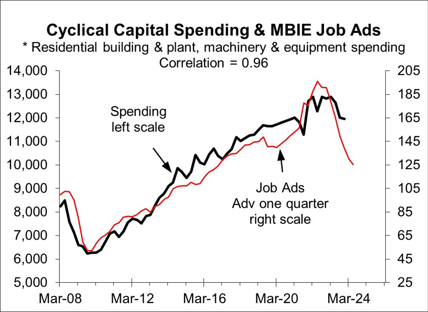 The best fit is with job ads leading by one quarter with them updated to Q1 2024 versus Q4 2023 for the cyclical capital spending component of GDP. Allowing for the one quarter lagged impact, the fall in job ads points to significant further downside in cyclical capital spending over H1 2024 and possibly flowing into H2.