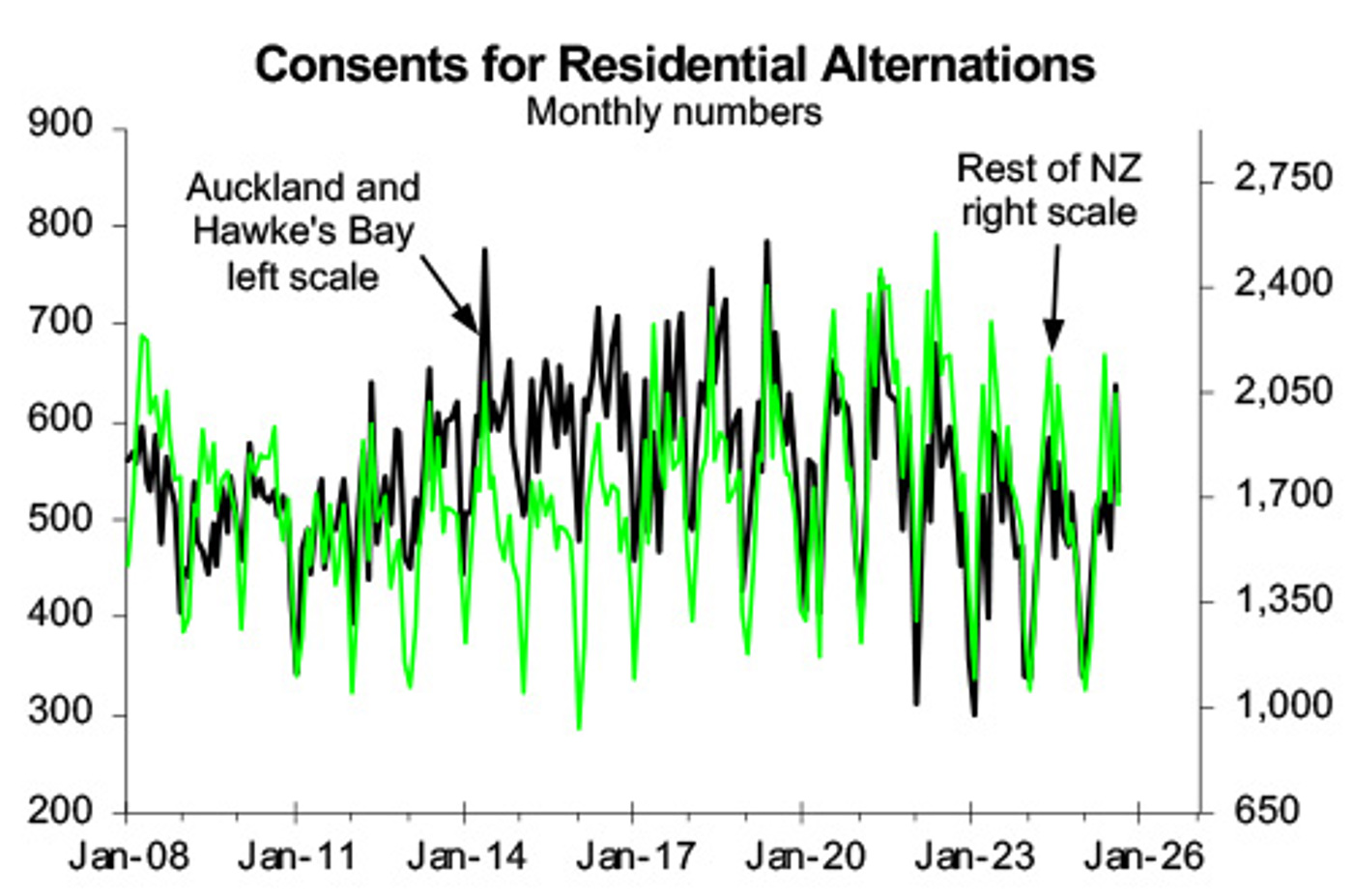 Like new builds, alterations to residential buildings are starting to show hints of rising driven mainly by a large fall in interest rates, says Kiwi economist Rodney Dickens.