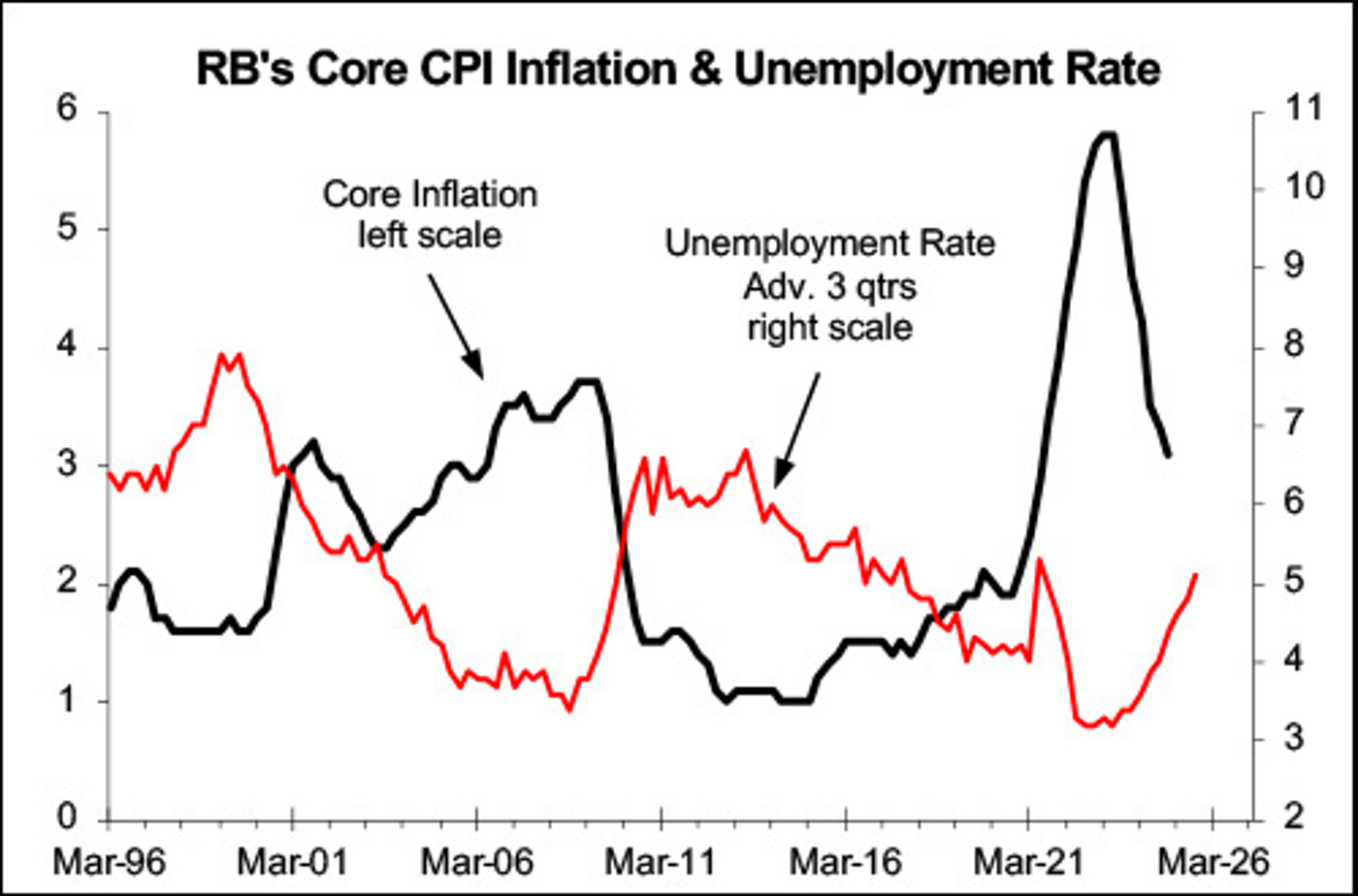 The second chart shows the unemployment rate to be a useful predictor of what the Reserve Bank’s measure of core consumer price (CPI) inflation will do (black line, left scale). The best fit is with the red unemployment line (right scale) advanced or leading by three quarters. The core measure removes the impact of volatile factors and better shows underlying price inflation. The continued rise in the unemployment rate should mean core CPI inflation continues to fall until around mid-2026.