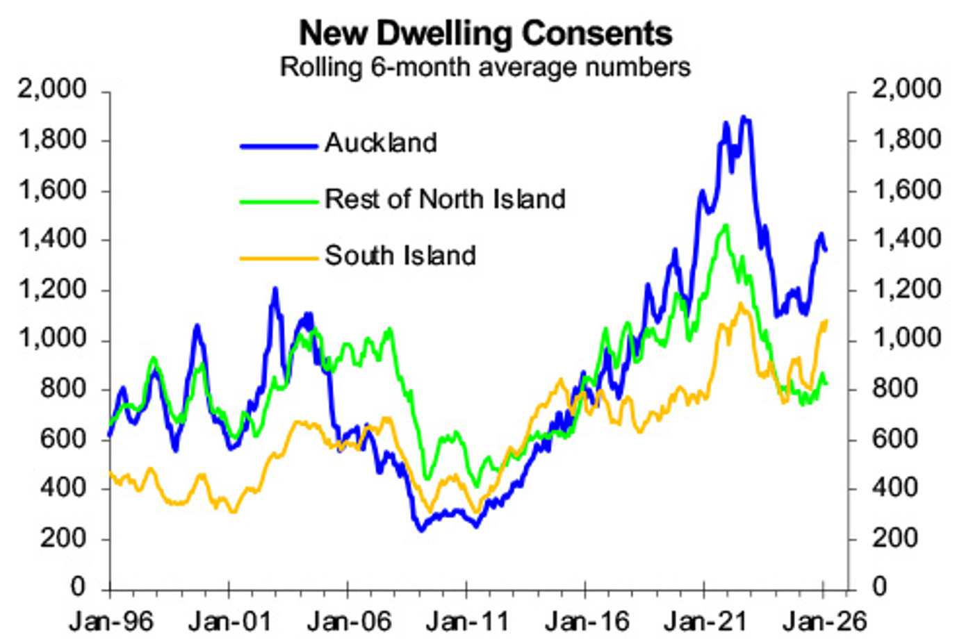 An upturn in residential building is underway in much of the country, as shown in the first chart. With it taking around a year for interest rates to impact, quite a bit of the stimulus from the fall in interest rates is still to come, and the upturn should be only around half done. That is, provided it is not derailed too much by fallout from the US-Israel war on Iran.