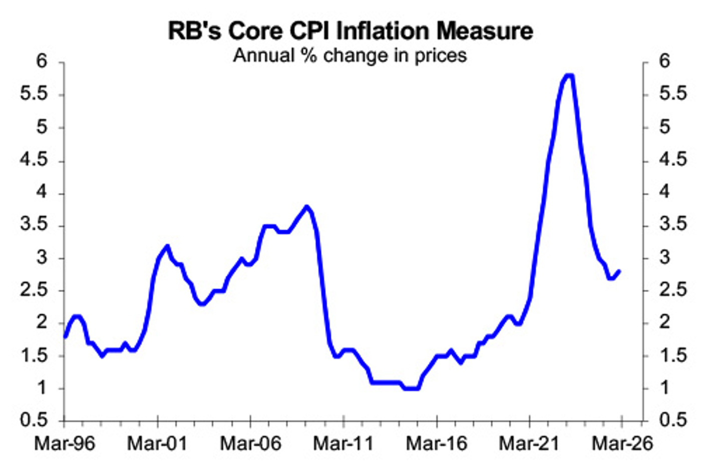The spike in the oil price caused by the war has driven up petrol and, more so, diesel prices. This will boost actual consumer price (CPI) inflation to as high as 4% this year, well above the top of the Reserve Bank’s 1-3% target range. However, the Reserve Bank focuses most on its measure of core CPI inflation, shown in the second chart, that was already showing hints of increasing at the end of 2025.